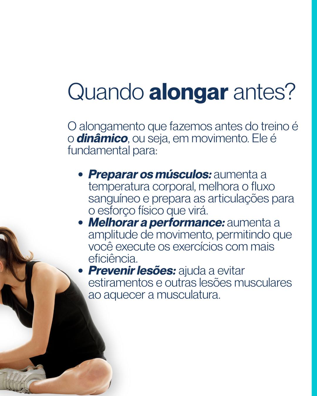 Antes, use o alongamento dinâmico (em movimento) para aquecer os músculos, preparar seu corpo e evitar lesões.